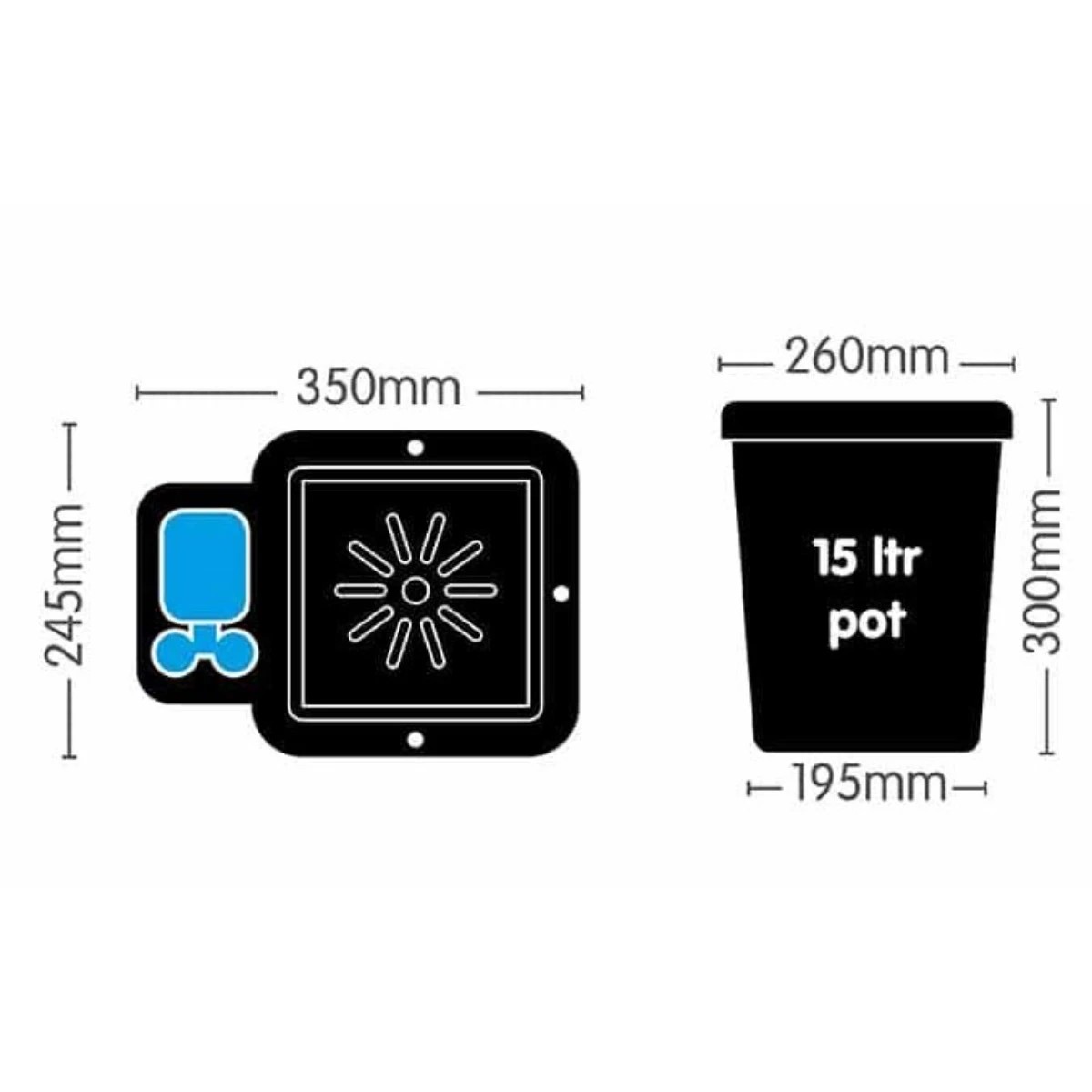 Das 1Pot-Modul ist äußerst vielseitig und kann für eine breite Palette von Pflanzensorten und -größen verwendet werden. Das 1Pot-Modul lässt sich leicht erweitern, so dass viele Töpfe an einen einzigen Tank angeschlossen werden können. Mit dem 15-Liter-Topf, der mit allen 1Pot-Modulen geliefert wird, können Sie große Solitärpflanzen züchten.