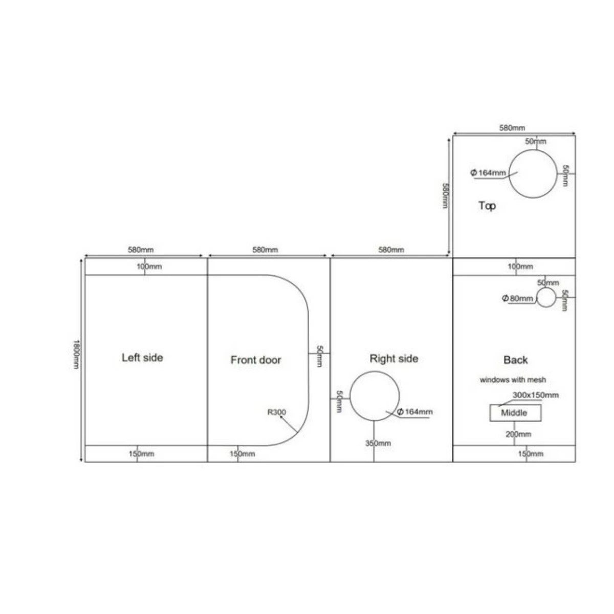 - Öffnungen und Zubehör 1x Ø 80 mm (hintere Wand, oben) 1x Ø 160 mm (rechte Seite, unten) 1x Ø 164 mm (Dach) 1x 40 x 20 cm Insektenschutzgitter (verschließbar, Klettverschluss)